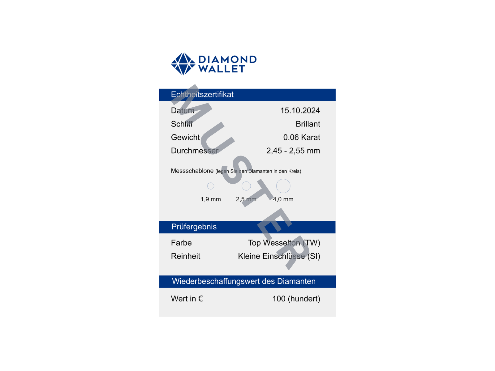 Das Echtheitszertifikat weist die Qualität und den Wiederbeschaffungswert des Diamanten nach.